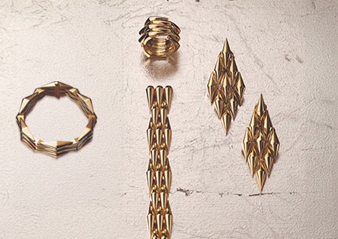 The new creation honours the original’s classic geometric aesthetics, employing a gold-woven rhomboid-shaped motif crafted in warm-toned 18-karat gold, secured by invisible flexible links. This distinctive design is now reinterpreted in five jewellery creations – necklace, bracelet, ring, and two earrings, alongside a one-of-a-kind high jewellery masterpiece.