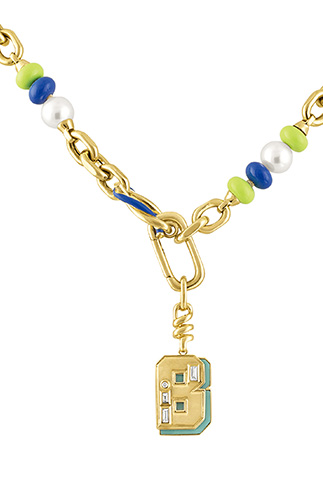 It exemplifies the brand’s signature aesthetic: Contrasting the softness of pearls with more masculine elements like chunky gold chains, enamel beads and diamonds.