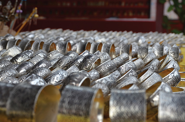 Exports are manufactured by five to six bigger enterprises, including Phoummasack’s Thawin Production, that are equipped with state-of-the-art machinery to create modern silver jewellery for international markets. These vary from plain silver pieces to gem-set designs.