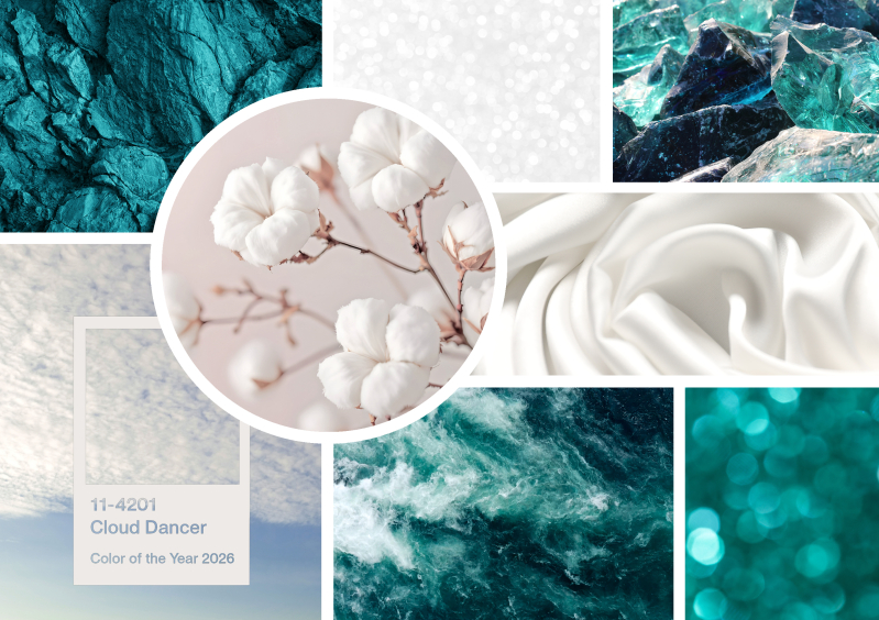 彩通色彩研究所(Pantone Color Institute)将轻盈的白色“云上舞白”(Cloud Dancer)定为年度代表色。与此同时,消费趋势预测机构WGSN与Coloro则力推“蜕变蓝绿”(Transformative Teal )——一种融合深邃蓝调与湖水绿意的色调。