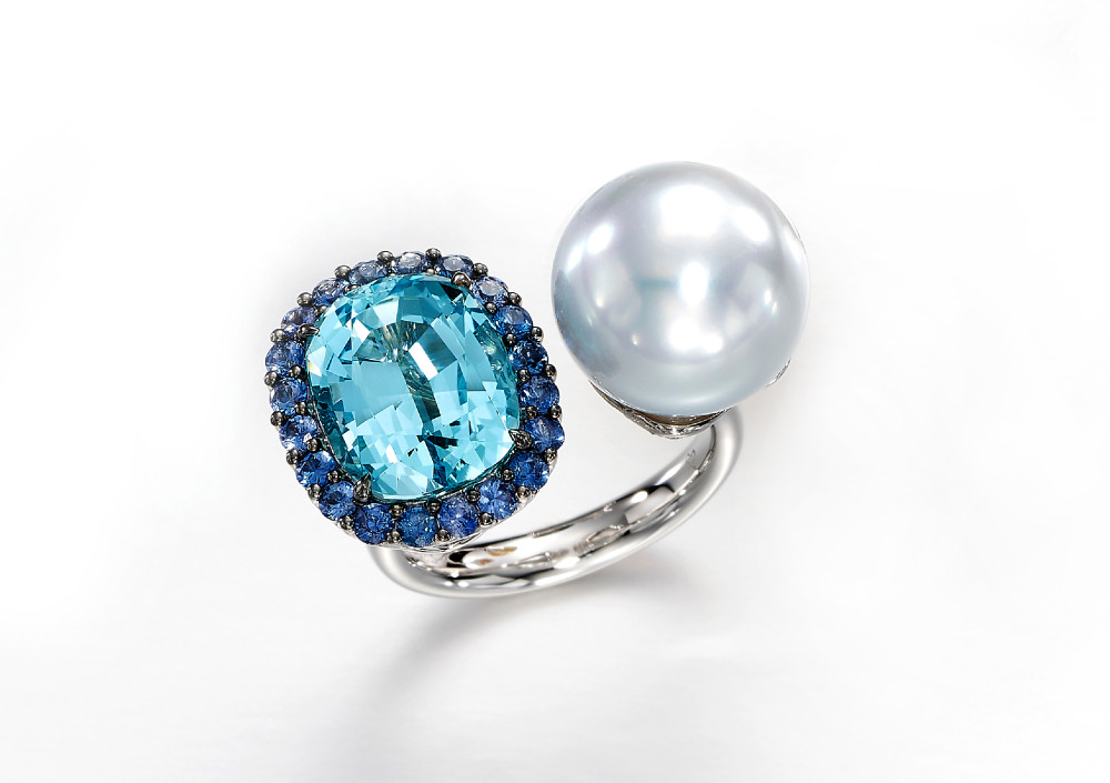 White South Sea pearl ring with blue topaz and sapphires by Rio Pearl